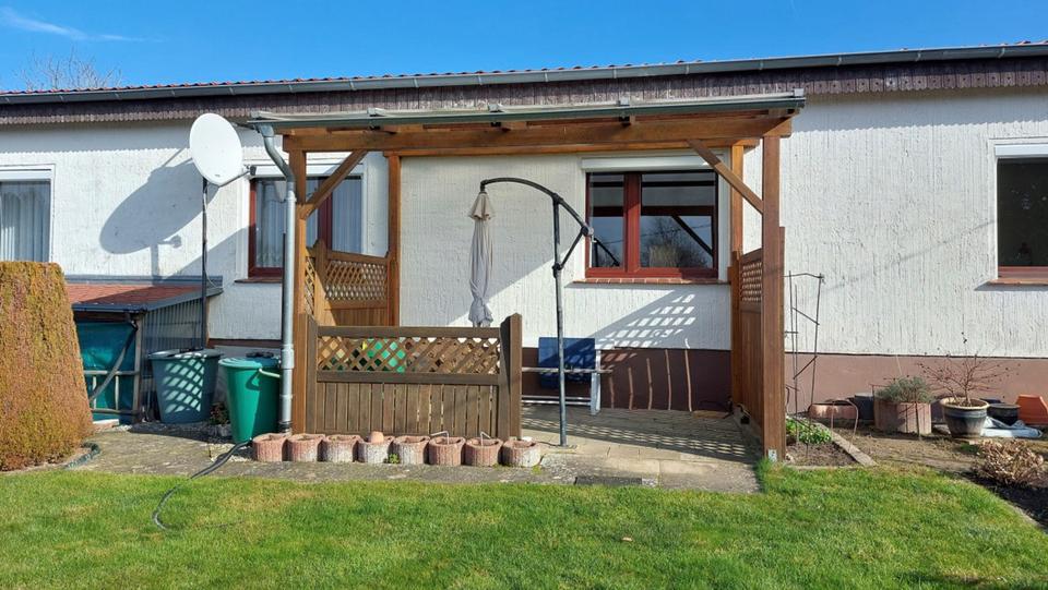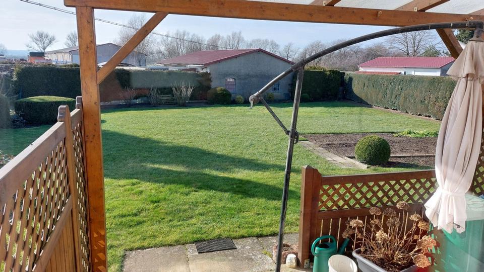 Hinter dem Haus erstreckt sich eine schöne Gartenfläche mit einer Terrasse. Heute findet man viel Grün vor...mag jeder gestalten, wie er es möchte.