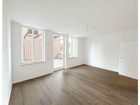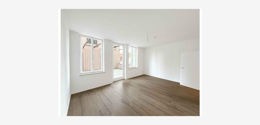 Das helle Schlafzimmer sowie das lichtdurchflutete Wohnzimmer bieten eine angenehme Wohnatmosphäre; vom Wohnzimmer aus gelangen Sie direkt auf die großzügige Dachterrasse.