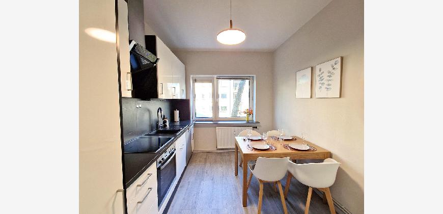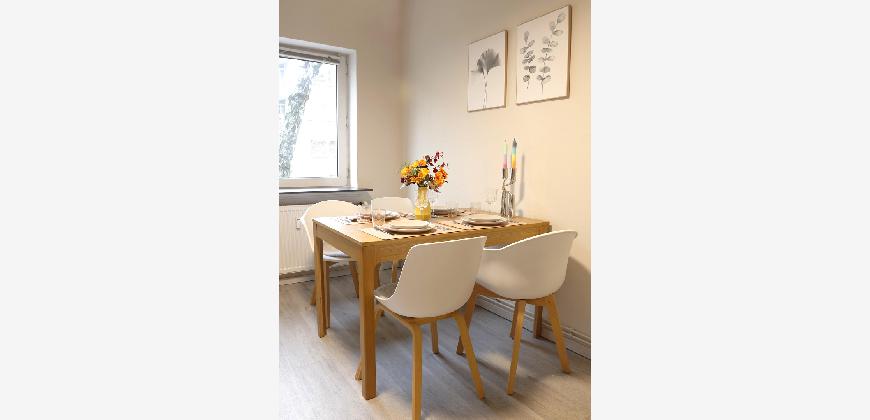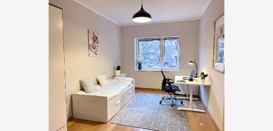 Stylish fully furnished 3-room apartment (approx. 76 sqm) with southeast-facing loggia in Hamburg-Winterhude. All-inclusive monthly rent €2100 (utilities, heating, electricity and high-speed Wi-Fi). High ceilings, solid oak floors, two bedrooms with a dedicated home office, fully equipped kitchen and ready to move in with just a suitcase. Quiet cul-de-sac location between Stadtpark, Alster and Mühlenkamp. English-speaking landlord – ideal for 1–2 professionals, international companies, expats or a small relocating family who value comfort, convenience and a prime location.