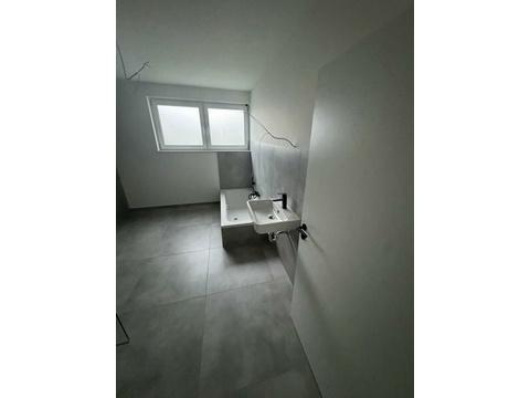 Beim Betreten der rollstuhlgerechten Wohnung gelangen Sie in einen zentralen Flur. Auf der rechten Seite befindet sich das Badezimmer mit Fenster, ausgestattet mit WC, Waschbecken, Badewanne, ebenerdiger Dusche und Waschmaschinenanschluss.