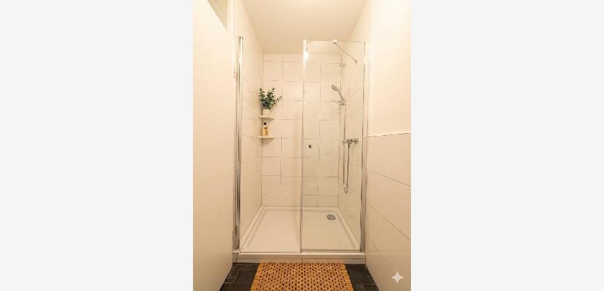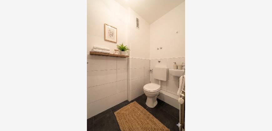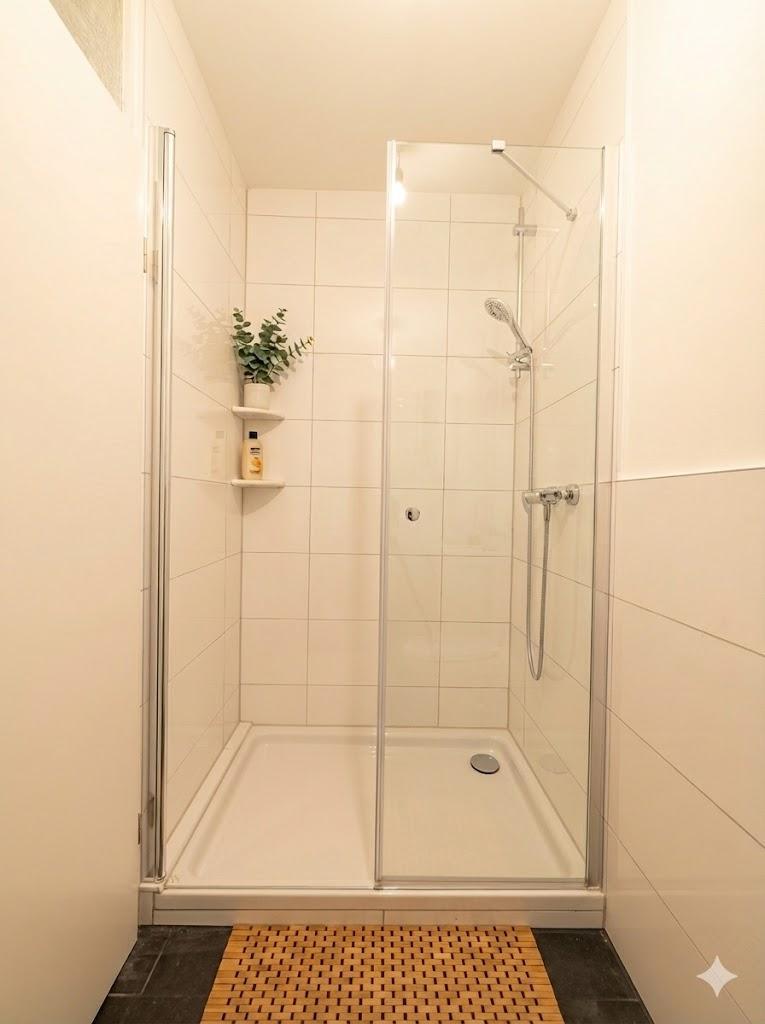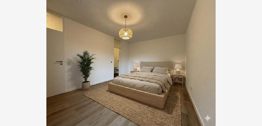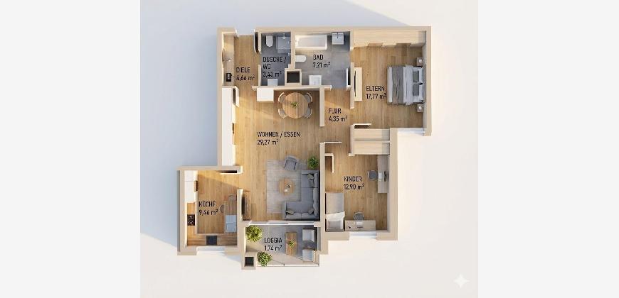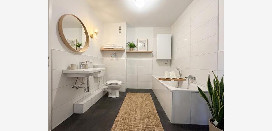 Die Wohnung wurde renoviert und wirkt durch ihre modernen Oberflächen, frischen Fliesen und klaren Raumstrukturen zeitgemäß und gepflegt. Die Loggia bietet einen geschützten Außenbereich, der den Wohnraum optimal ergänzt. Die Kombination aus Gäste-Duschbad im Eingangsbereich und großem Badezimmer mit direktem Zugang aus dem Elternschlafzimmer ist ein besonderes Komfortmerkmal und sorgt für Flexibilität im Alltag. Der offene Wohn- und Essbereich schafft durch seine Helligkeit und Größe eine einladende Wohnatmosphäre, während die separate Küche eine angenehme räumliche Aufteilung ermöglicht. Ein Kellerraum sowie ein eigener Stellplatz runden das Angebot ab und sorgen für praktische Ablagemöglichkeiten und bequeme Parkmöglichkeiten.