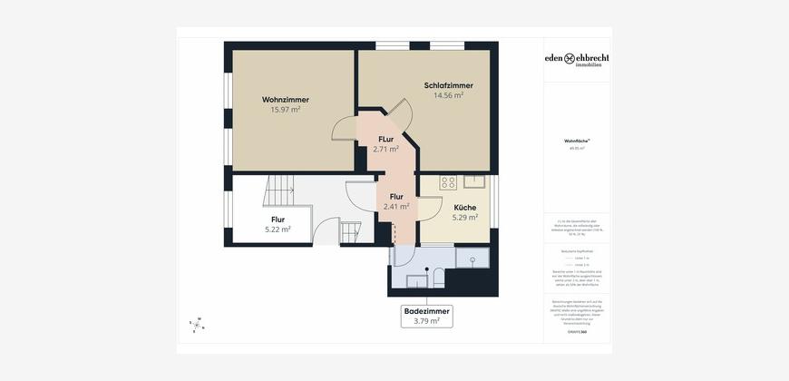 Direkt neben der Küche befindet sich dann noch das ca. 4 qm große Badezimmer, welches mit Dusche mit Glastür, WC, Waschtisch mit Unterschrank, Spiegel und Spiegelleuchte ausgestattet wurde. Hier finden Sie auch Platz für Ihre Waschmaschine. Hinter der Tür befindet sich noch ein fast raumhoher Einbauschrank, der Ihnen ausreichen Abstellflächen für Kosmetik-, Hygieneartikel & Co bietet. Das Bad ist mit anthrazitfarbenen Bodenfliesen und weißen Wandfliesen mit dezenten Edelstahl-Abschlusskanten ausgestattet. Zwischen Küche und Bad wurde noch ein kleines Oberlicht eingebaut, welches für Tageslicht auch im Bad sorgt.