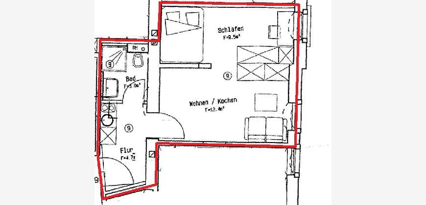 Der Grundriss ist funktional und gut nutzbar: Der Wohn- und Schlafbereich bietet ausreichend Platz für Wohnen, Arbeiten und Entspannen. Durch die klare Raumstruktur lässt sich die Wohnung flexibel möblieren. Die separate Küche sowie das Badezimmer sind praktisch angeordnet und sorgen für eine angenehme Wohnqualität auf kompakter Fläche.
