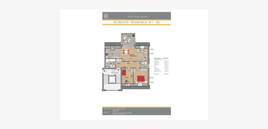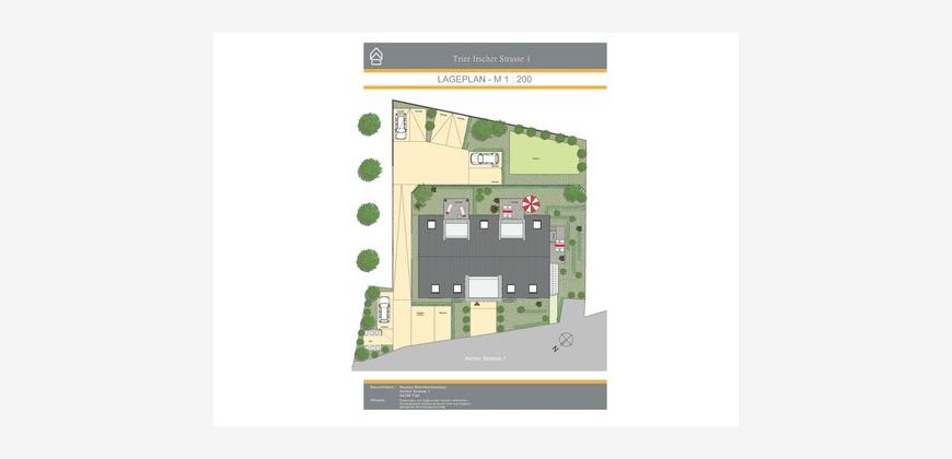 LagebeschreibungTrier-Irsch, gefragte Wohnlage. Alle Einrichtungen des täglichen Bedarfs sind auf kurzen Wegen erreichbar, z.B. im Einkaufszentrum Trier-Tarforst. Ebenso ist eine gute Verkehrsanbindung in alle Richtungen gegeben.