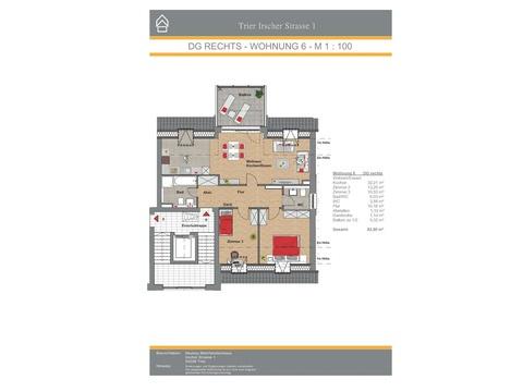 Das Angebot bezieht sich auf die Eigentumswohnung Nr. 6 im Dachgeschoss. Die Wohnung besteht aus dem attraktiven Wohnraum mit integrierter Küche (mit einer modernen Einbauküche) von ca. 32 m² mit Zugang auf den schönen Balkon von ca. 10 m². Von der zentralen Diele erreichen Sie das geräumige Schlafzimmer von ca. 13 m², das Bad (ausgestattet mit Wanne und Dusche), das Büro/Kinderzimmer von ca. 10 m² und das Gäste-WC.