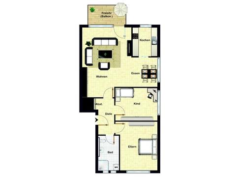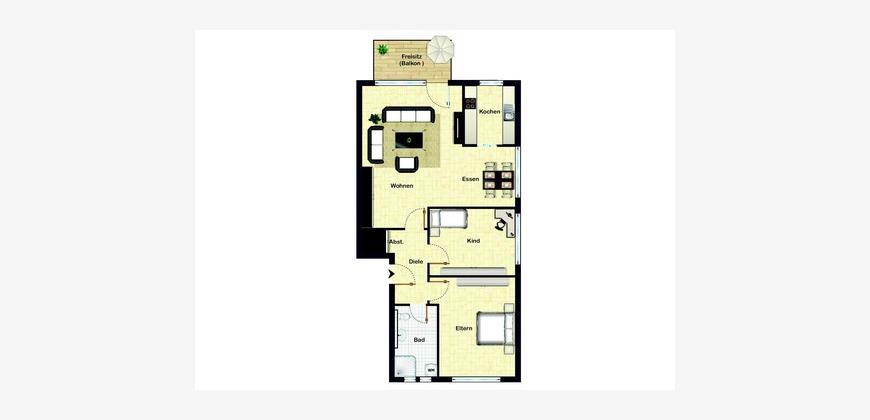 Ein Objekt in attraktiver Bauweise in einem gepflegten und ruhigen Vierfamilienhaus. Die Obergeschosswohnung ist aufgeteilt in Wohn- Esszimmer mit großzügigem Südbalkon, Küche, Flur, Schlafzimmer, bodengleiche Duschbad mit WC, Kinderzimmer, Abstellraum. Zur Wohnung gehören ein eigener Keller und Kfz- Stellplatz, der mit 12,78 € mtl. berechnet wird. Für die Fahrräder steht ein Schuppen zur Verfügung. Ein separater, großzügiger Wasch- und Trockenkeller ist vorhanden.