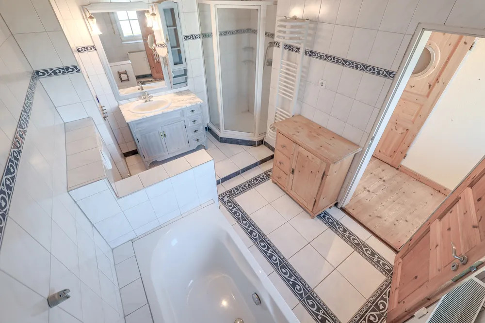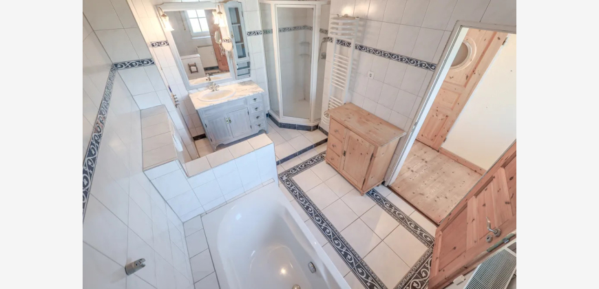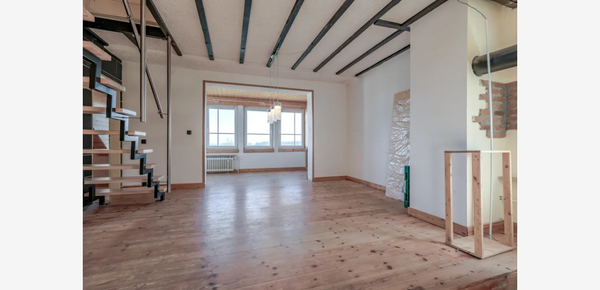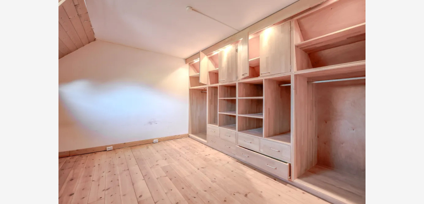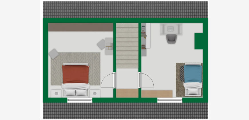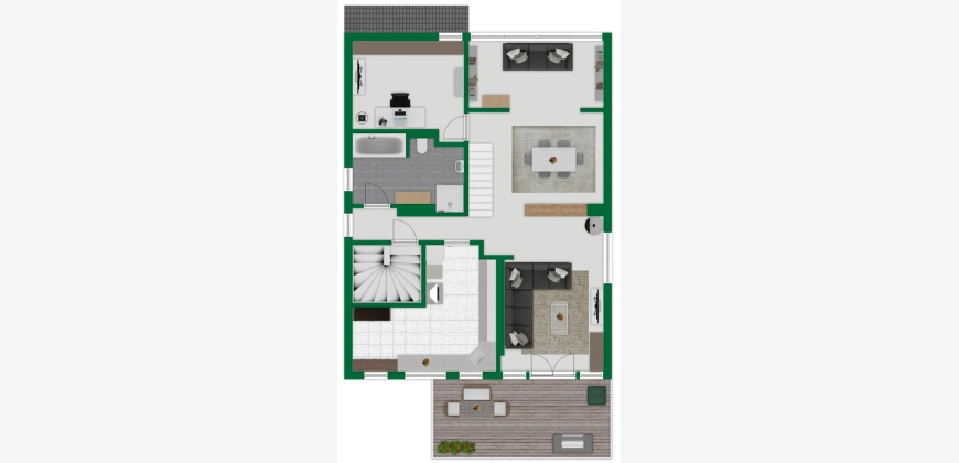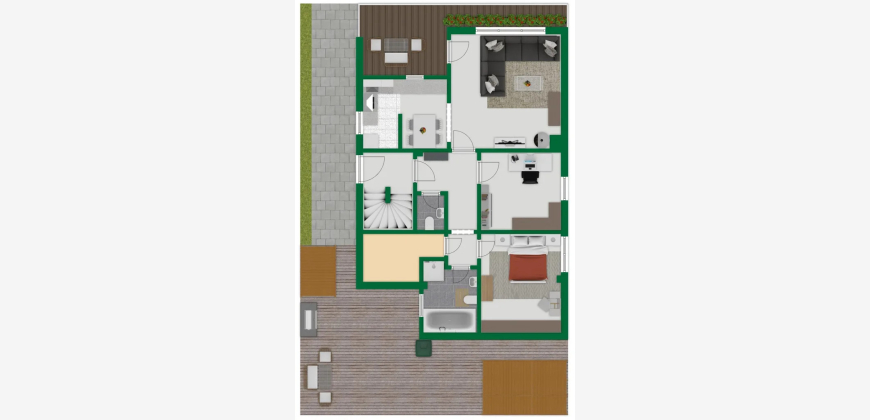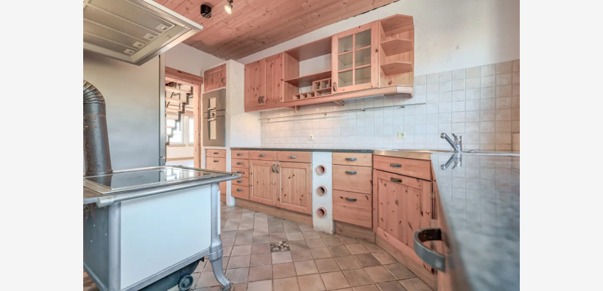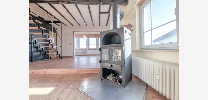 Das Obergeschoss verfügt über einen großzügigen Wohn- und Essbereich mit Zugang zur Terrasse, einen kleinen, an das Wohnzimmer angrenzenden Raum, eine Küche, ein Badezimmer sowie eine Treppe in die Dachspitze mit den zwei zusätzlich ausgebauten Räumen.