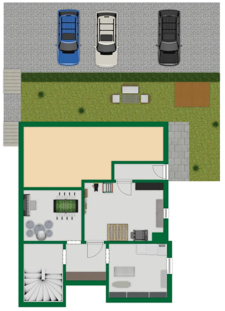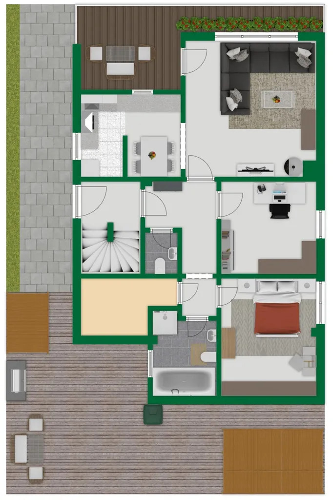 Im Erdgeschoss befinden sich ein Wohnzimmer, ein Arbeitszimmer, ein Schlafzimmer, ein Badezimmer, ein separates Gäste-WC sowie ein überdachter Balkon, der nachträglich abgedichtet wurde.