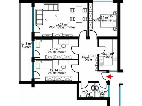 Drei Schlafzimmer ermöglichen auch großen Familien genügend Platz zu finden. Das mit ca. 26 m² geräumige Wohn-/Esszimmer bietet Ihnen ebenso Zugang zur Loggia, wie zwei der Schlafräume.