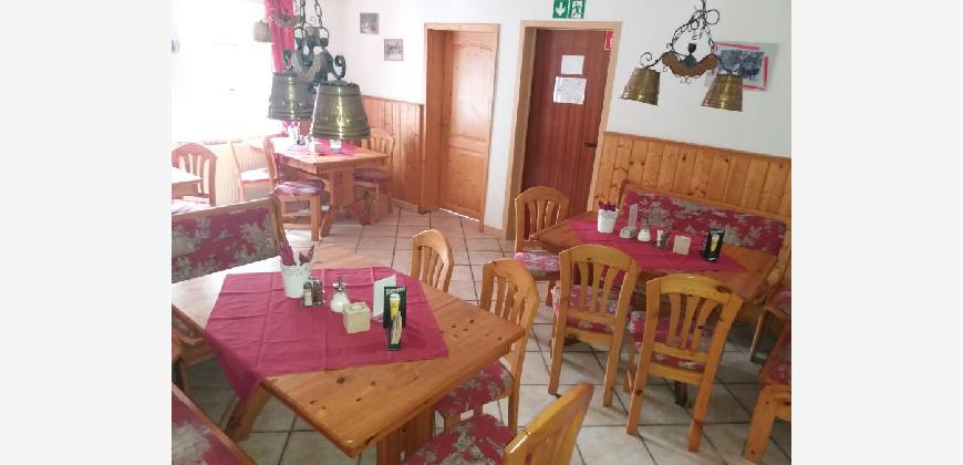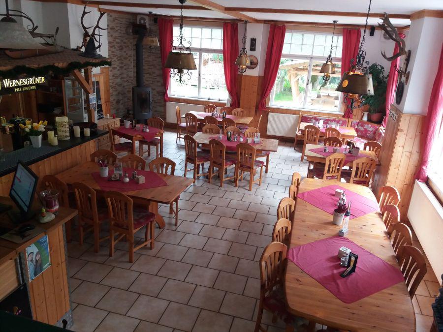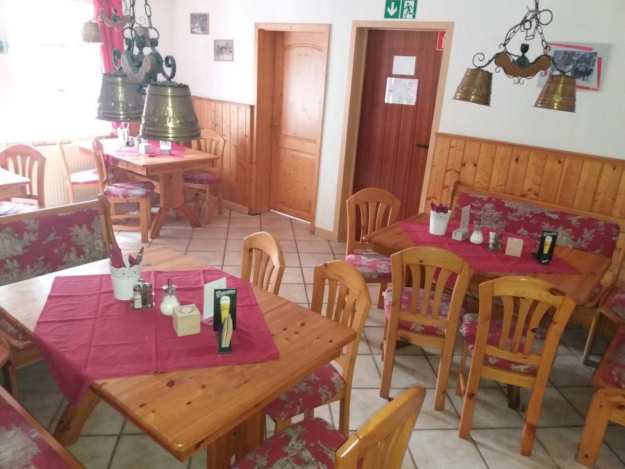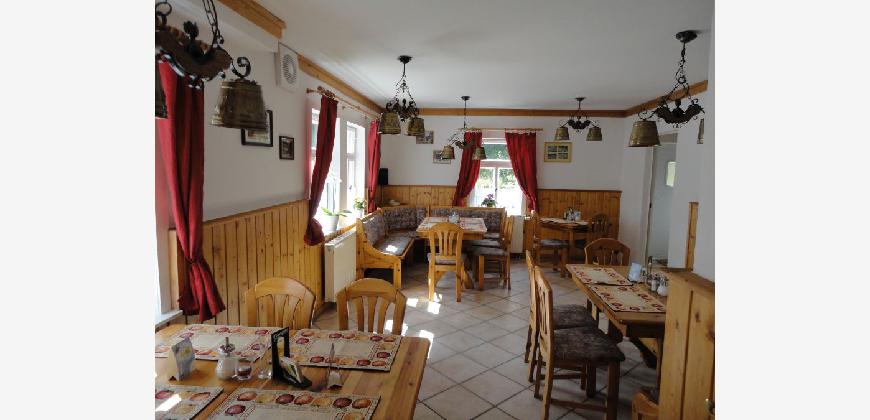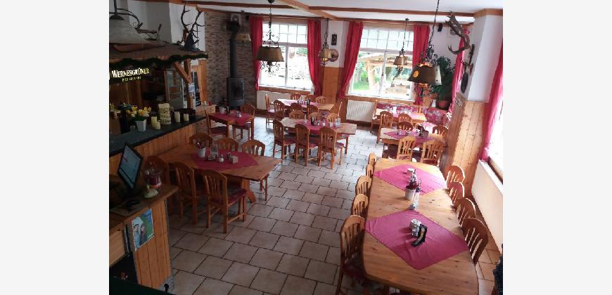 Der Hauptgastraum - im Gebäudeteil (II.) - umfasst ca. 45 Plätze. Hier ist ein Kamin vorhanden. (Halboffen) angrenzend liegt der Nebengastraum - im Gebäudeteil (I.) - mit weiteren 20 Plätzen. Daneben liegt dann der Aufenthaltsraum, der entweder eben als solcher oder aber als Erweiterung des Restaurants (ca. +20 Personen via Verbindungstür) oder gut als Buffetstandort bei Feierlichkeiten dienen kann.
