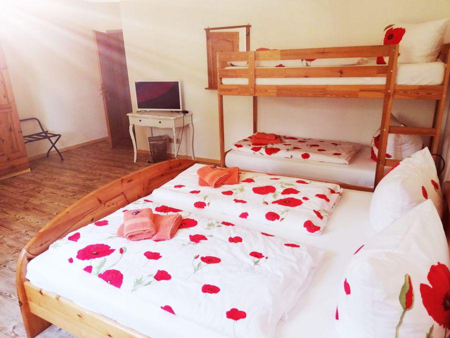 Die Zimmer sind alle laminiert und verfügen über rustikale Holzschränke und Doppelbetten mit Holzrahmen (einheitliche Kieferoptik ). 3 der 4 Familienzimmer verfügen darüber hinaus noch über ein Doppelstockbett, das 4te Familienzimmer hat dagegen ein zweites separates Schlafzimmer mit Doppelbett.