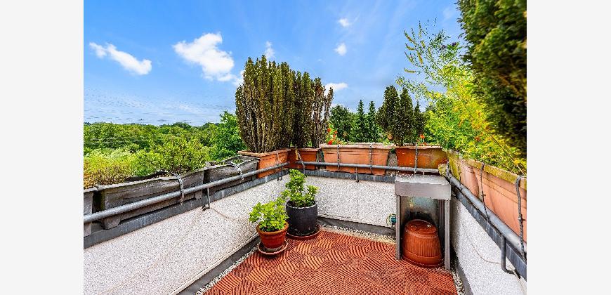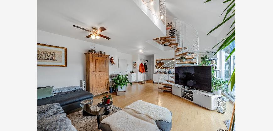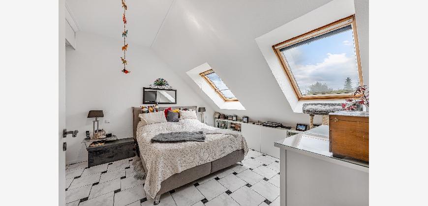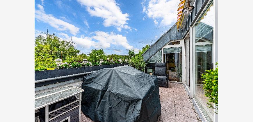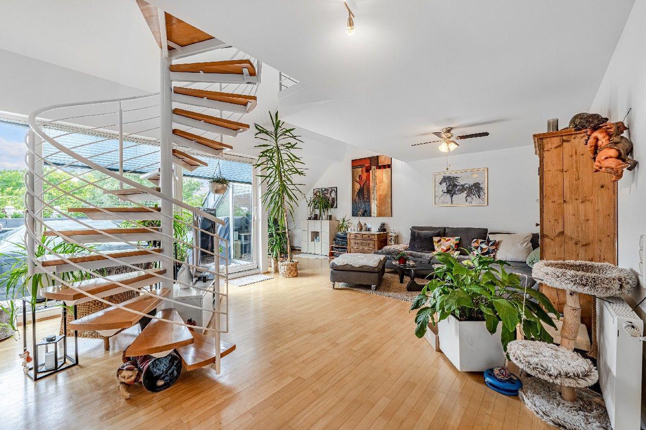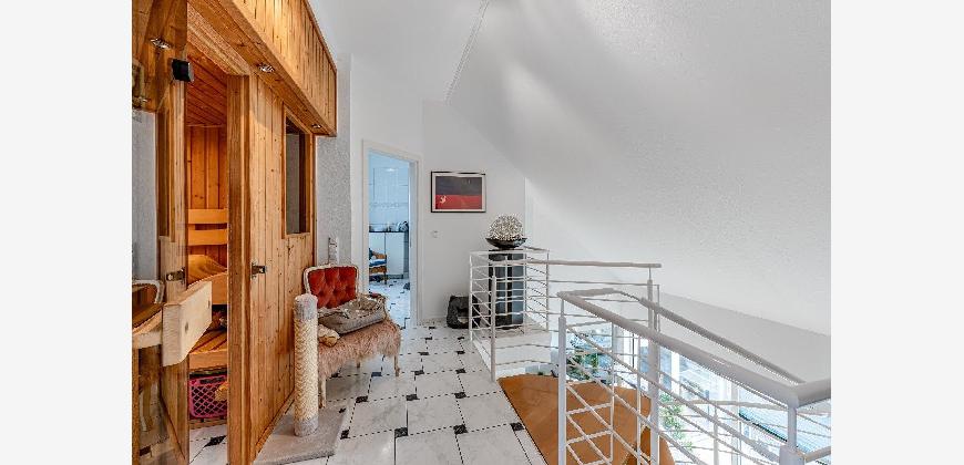 Eine filigrane Wendeltreppe führt ins Galeriegeschoss. Hier beeindruckt besonders der offene Galeriebereich mit Blick in das darunterliegende Geschoss die großzügige Deckenhöhe und der Lichteinfall schaffen ein luftiges, beinahe loftartiges Wohngefühl. Das Galeriegeschoss beherbergt ein geräumiges Elternschlafzimmer mit praktischen Einbauschränken sowie ein Tageslichtbad mit Dusche und Eckbadewanne. Ein weiterer, ursprünglich als Kinder- oder Gästezimmer geplanter Raum wird als private Sauna und Ruhezone genutzt. Ein Rückbau zur Nutzung als Büro oder Kinderzimmer ist auf Wunsch ohne großen Aufwand möglich. Von hier aus gelangen Sie direkt auf den zweiten, uneinsehbaren Balkon mit weitem Blick ins Grüne. Ein Rückzugsort mit echter Wellness-Qualität. Ein kleiner Abstellraum in der Dachschräge komplettiert die Wohneinheit.