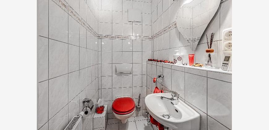 den jetzigen Mietern installiert. Bei gewünschter Eigennutzung kann die Küche von den Käufern entgeltlich übernommen werden. Ein innenliegendes Gäste-WC ergänzt das Raumangebot auf der Eingangsebene.