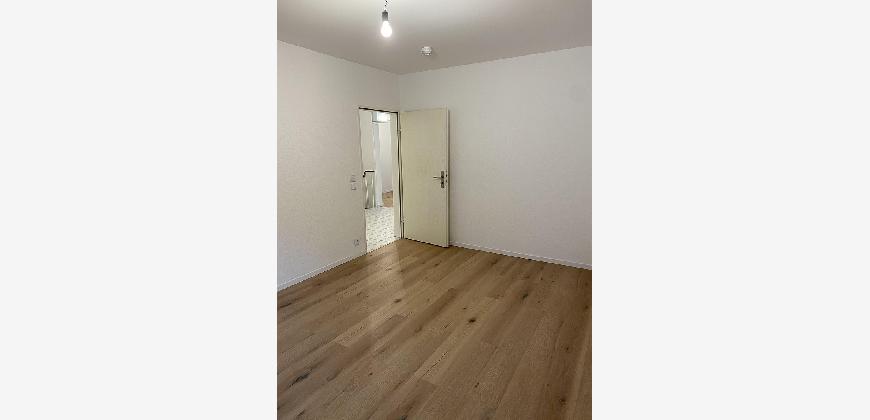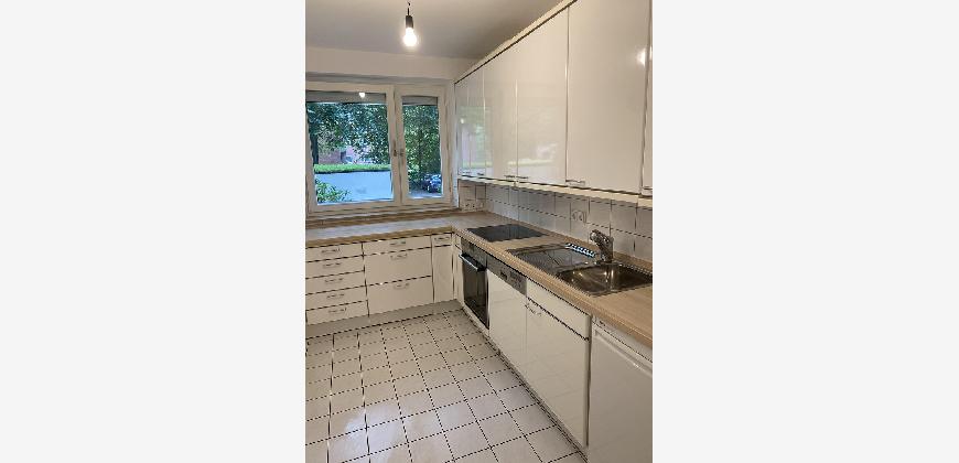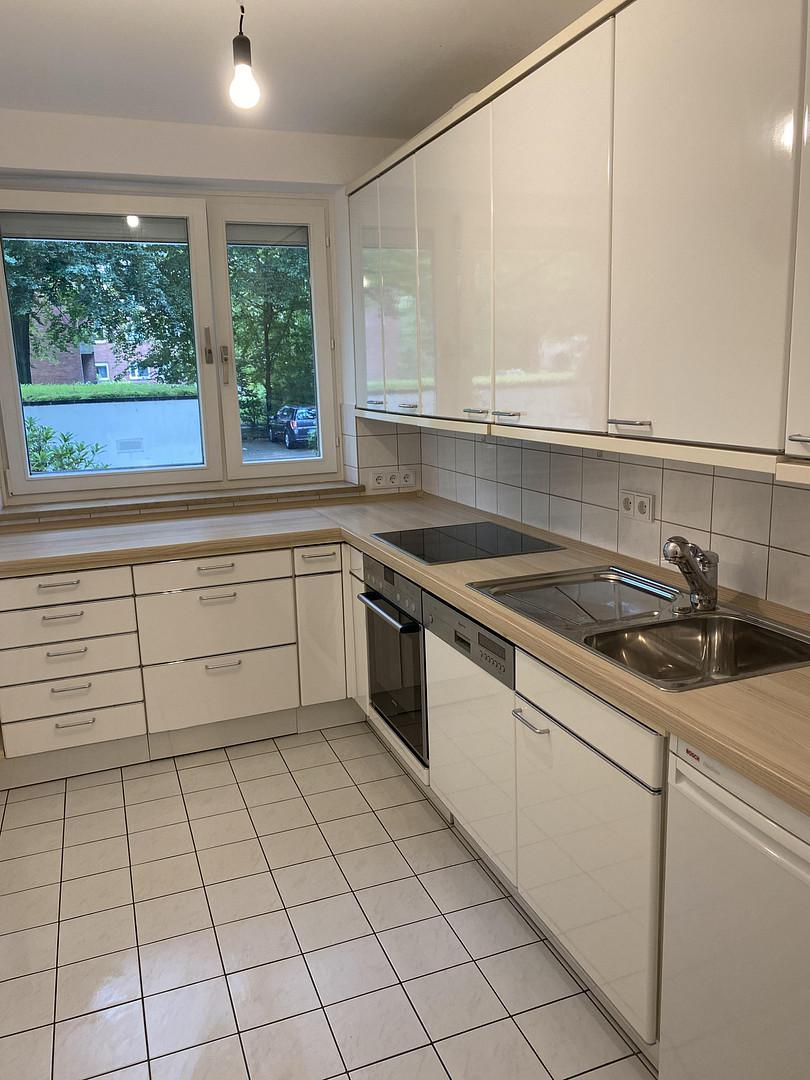 Die Einbauküche wird mit vermietet. Ofen, Herd mit Abzugshaube, Kühlschrank sowie eine große Spülmaschine sind vorhanden. Außerdem bietet die Küche sehr viel Stauraum und auch Platz für einen kleinen Tisch.