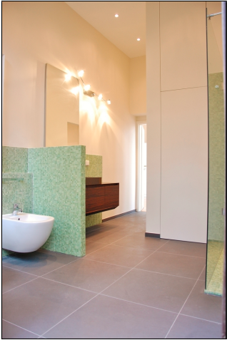 - Modern designer bathroom with large, floor-level shower