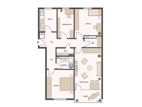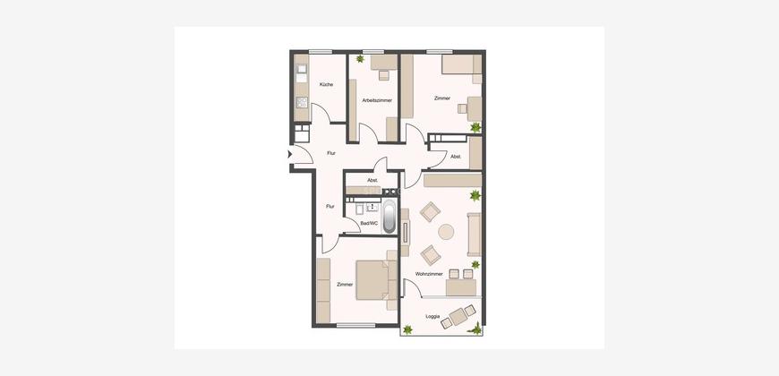Die Wohnung befindet sich im 1. OG. Sie ist damit ansprechend hell und bequem erreichbar. Die Wohnung hat eine Loggia zum Innenhof (Westorientierung).