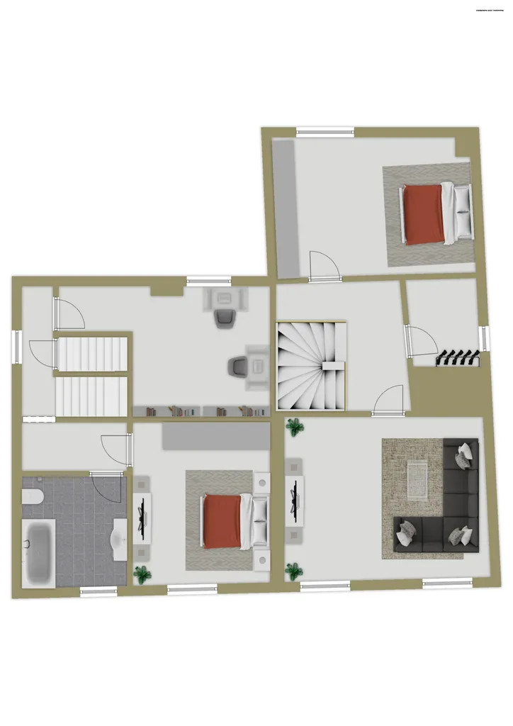 - Obergeschoss: Schlafzimmer, weiteres Zimmer (derzeit Büro), Tageslichtbad mit Badewanne
