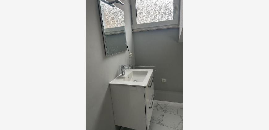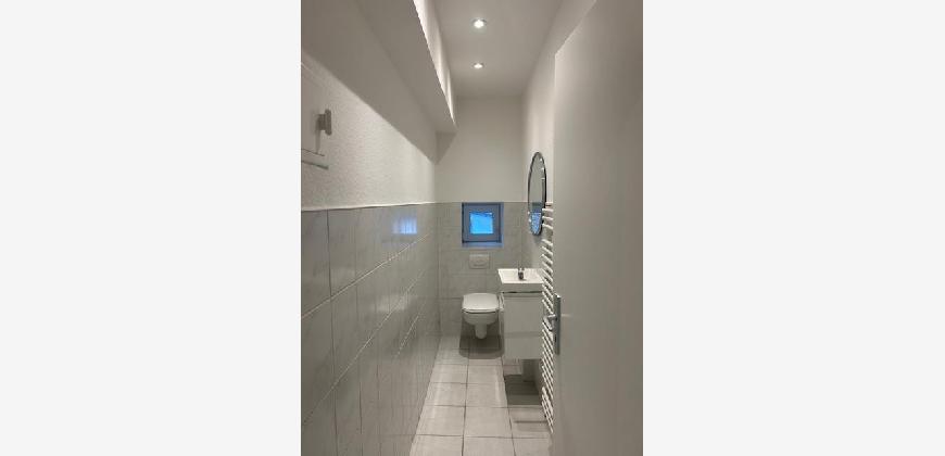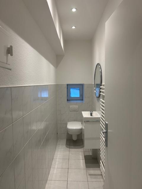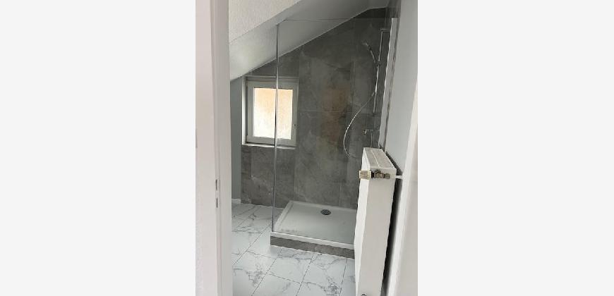Das neu gestaltete Badezimmer präsentiert sich in modernem Design: Eine großzügige Dusche und ein stilvolles Waschbecken sorgen für zeitgemäßen Komfort. Ein separates Gäste-WC erhöht den Wohnkomfort. In den Wohnräumen ist ein hochwertiger Vinylboden in warmem Holzdesign verlegt, der eine behagliche Atmosphäre schafft. Helle Fliesen in Marmoroptik verleihen dem Bad eine elegante, zeitlose Note und sind zugleich pflegeleicht.