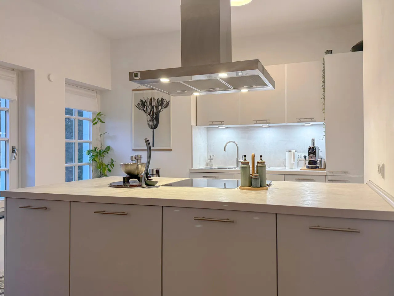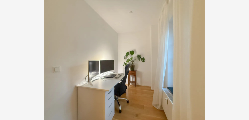 Auf der linken Seite öffnet sich das helle und geräumige Wohnzimmer, das zusätzlich über einen separaten Bürobereich verfügt und somit ideale Voraussetzungen für Homeoffice oder einen Arbeitsbereich bietet. Angrenzend befindet sich die große Küche, welche bei Interesse vom Vormieter übernommen werden kann.