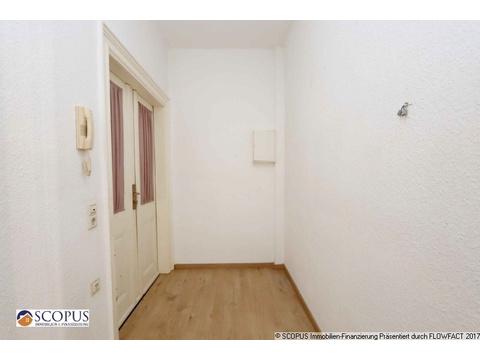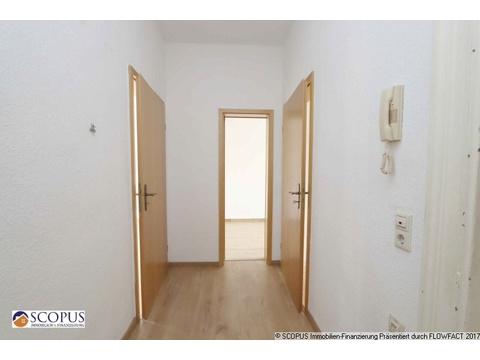 Der Flur verbindet das Wohn- und Schlafzimmer sowie die Küche. Das Tageslichtbad mit Wanne ist über die Küche erreichbar.