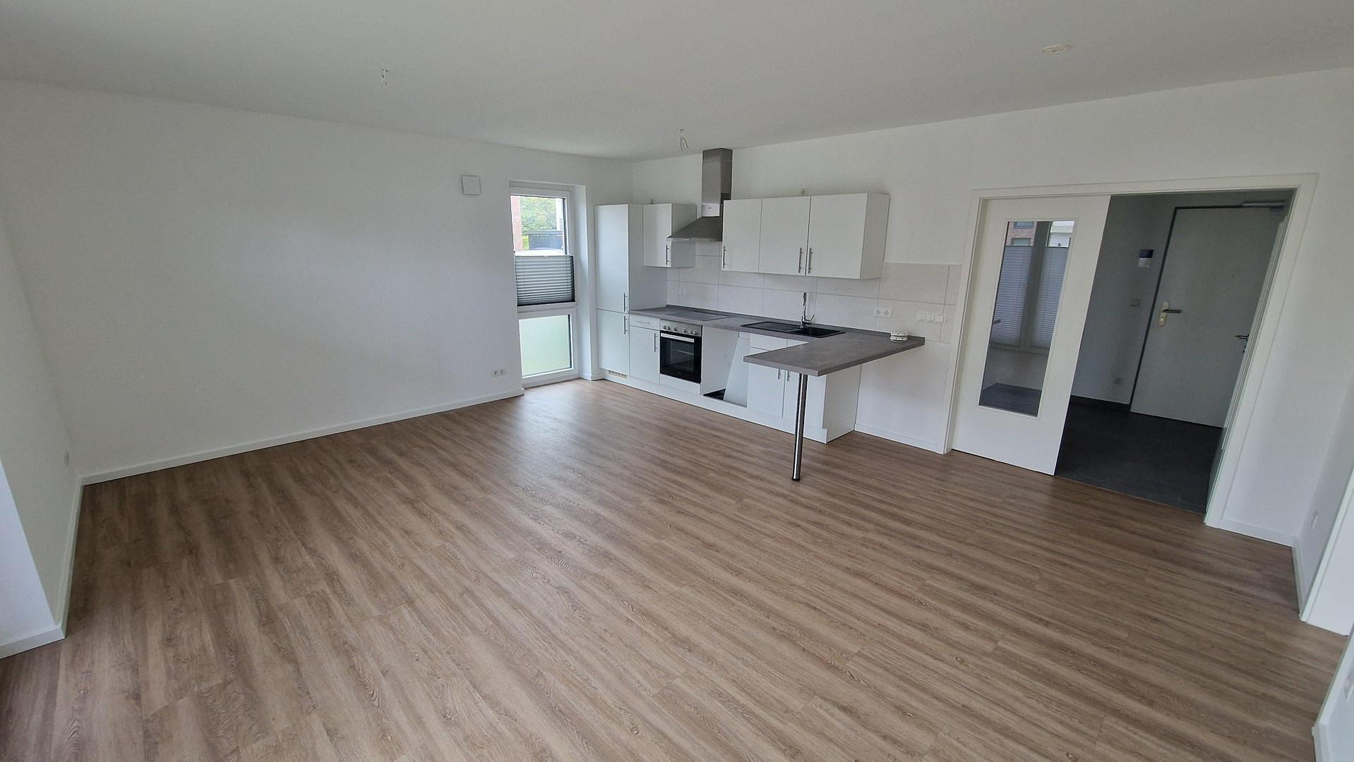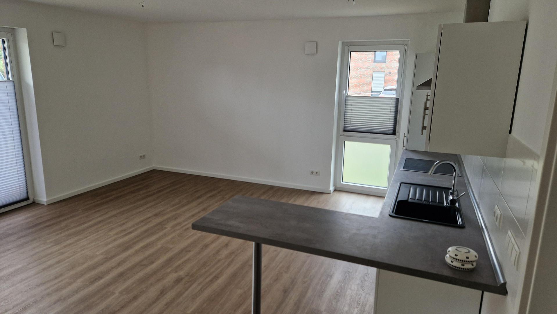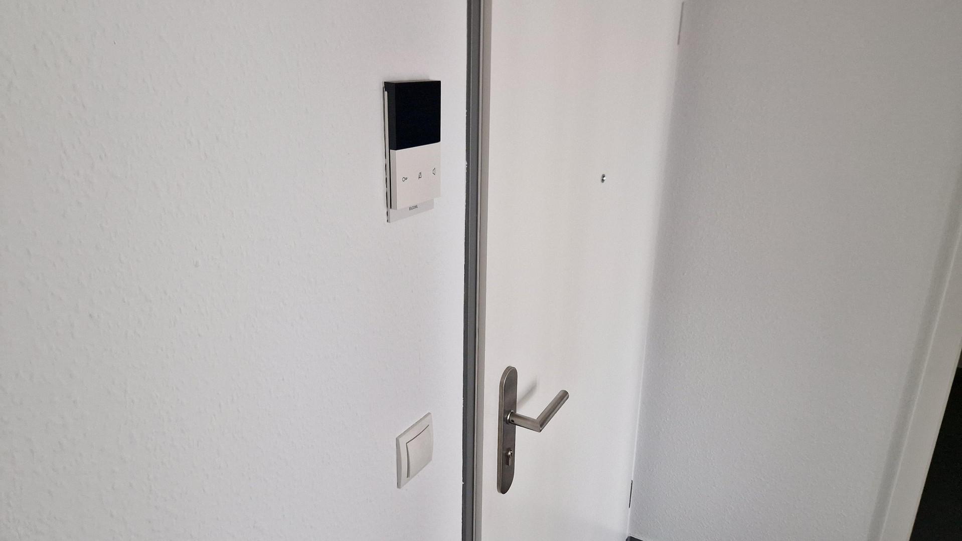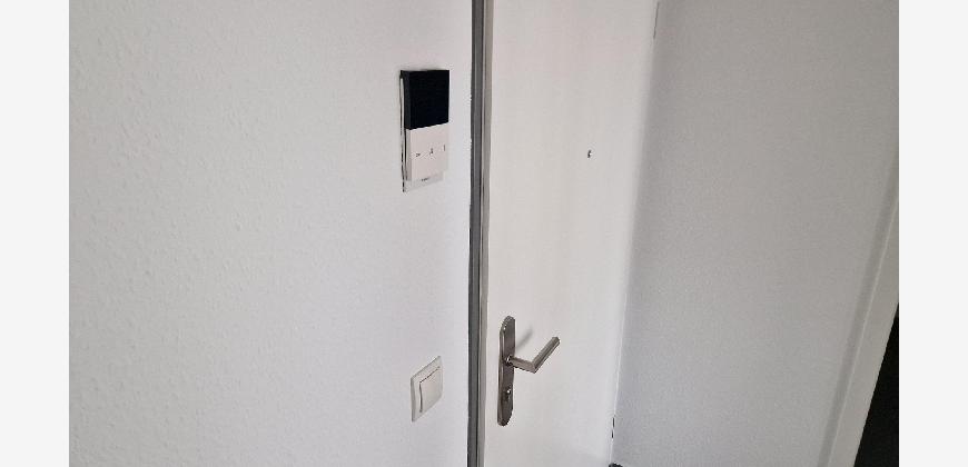 Die Wohnung verfügt über einen Flur, der Platz für eine Garderobe lässt, einen geräumigen Abstellraum mit einem Waschmaschinenanschluss und ein modernes Badezimmer. Wohn- und Schlafzimmer sind durch die großen Fenster hell und gut ausgeleuchtet.