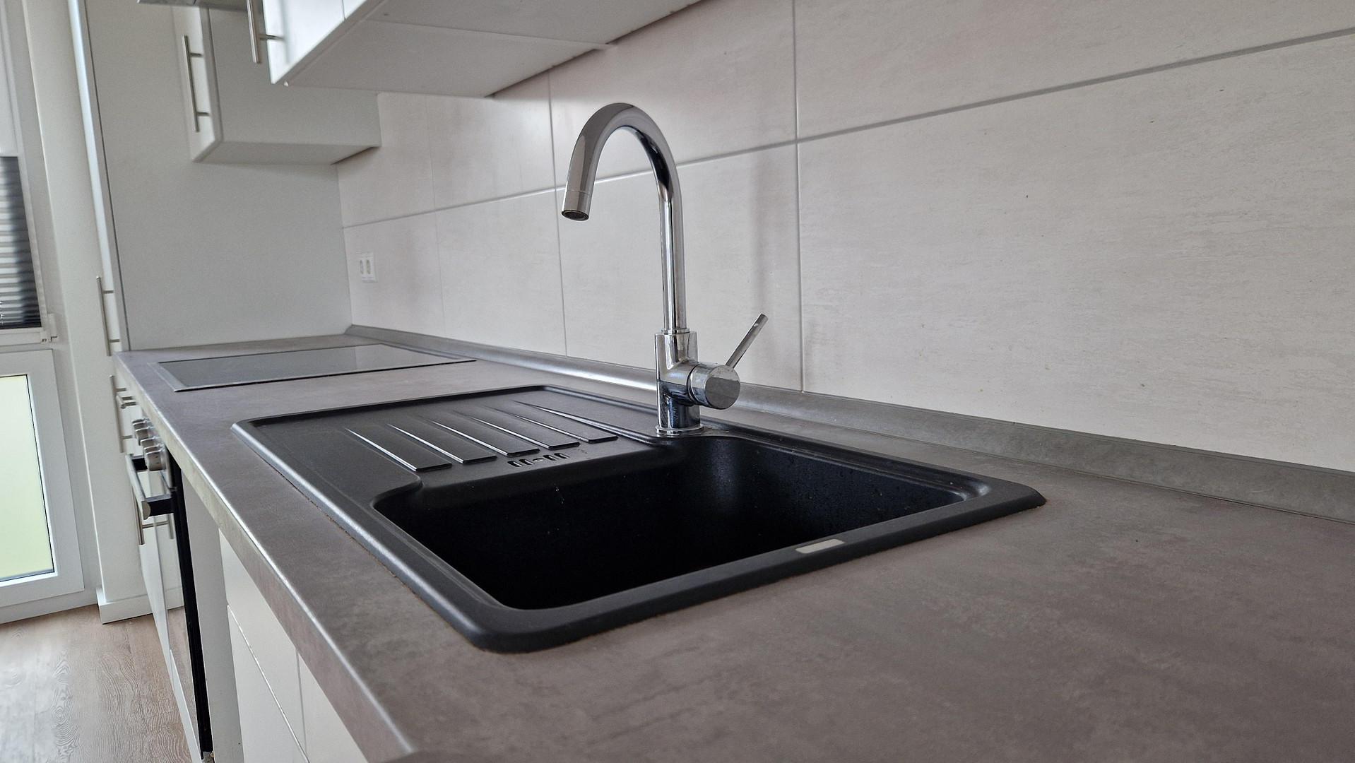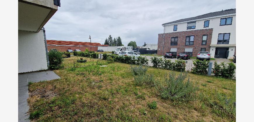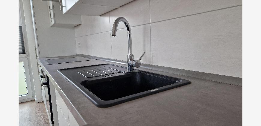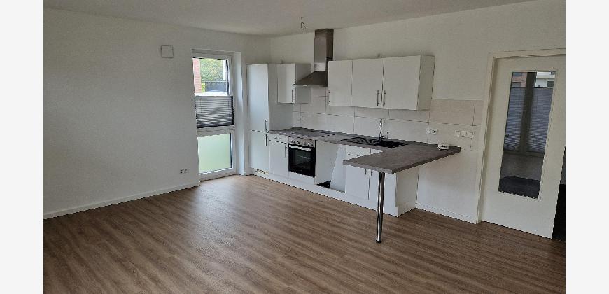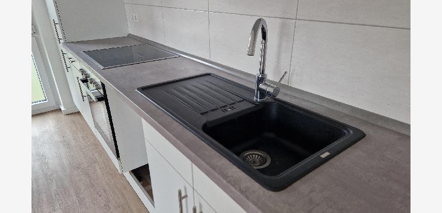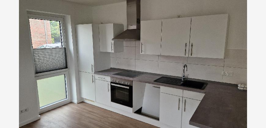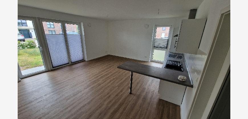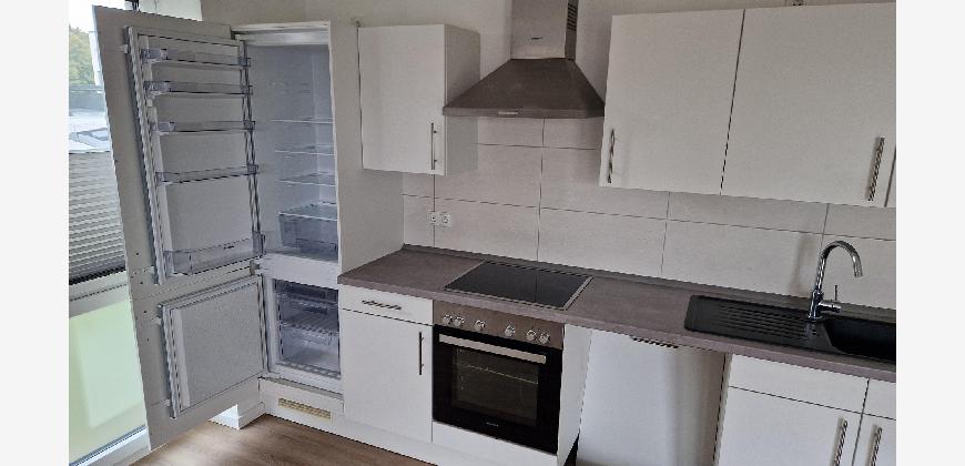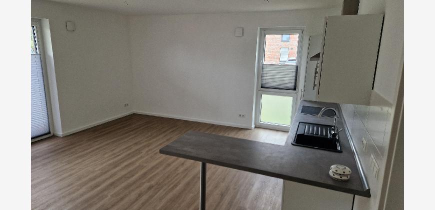 Die Wohnung verfügt über einen Flur, der Platz für eine Garderobe lässt, einen geräumigen Abstellraum mit einem Waschmaschinenanschluss und ein modernes Badezimmer. Wohn- und Schlafzimmer sind durch die großen Fenster hell und gut ausgeleuchtet.