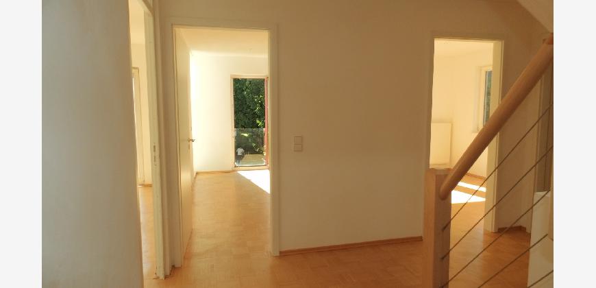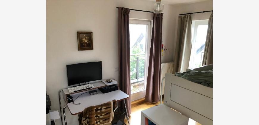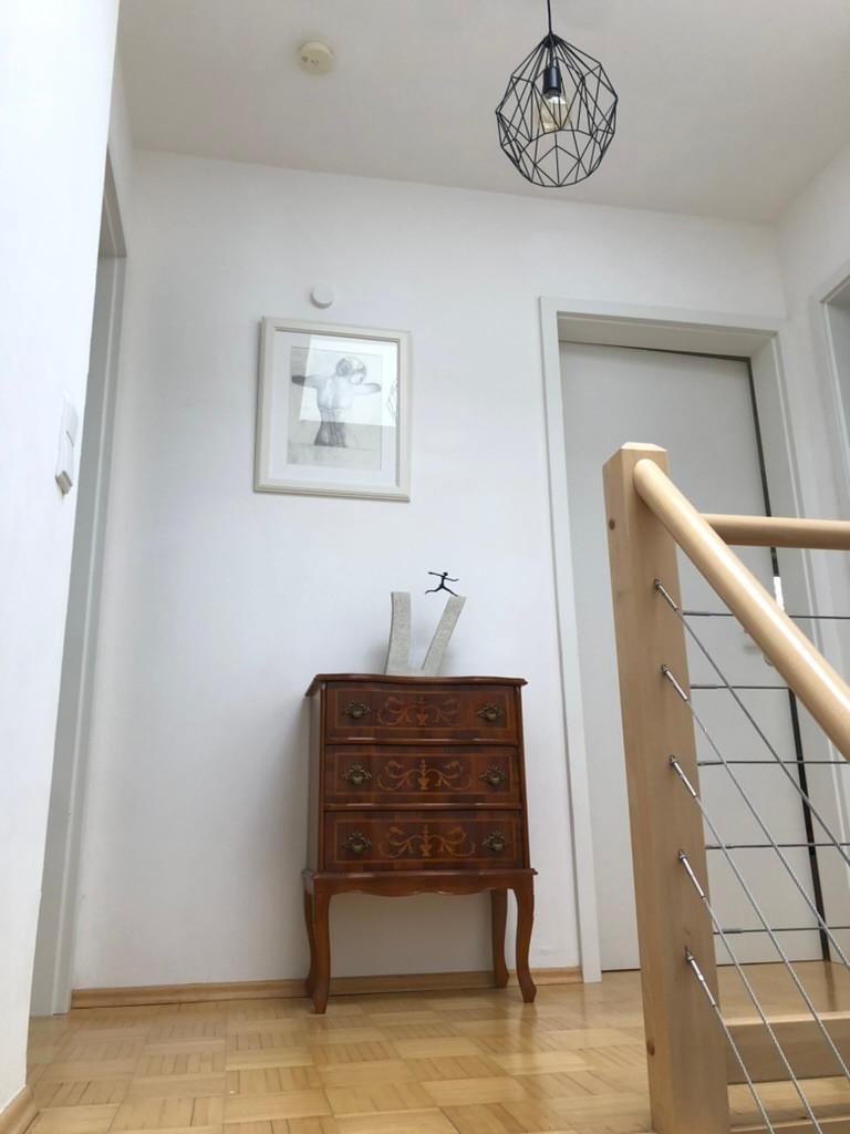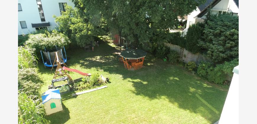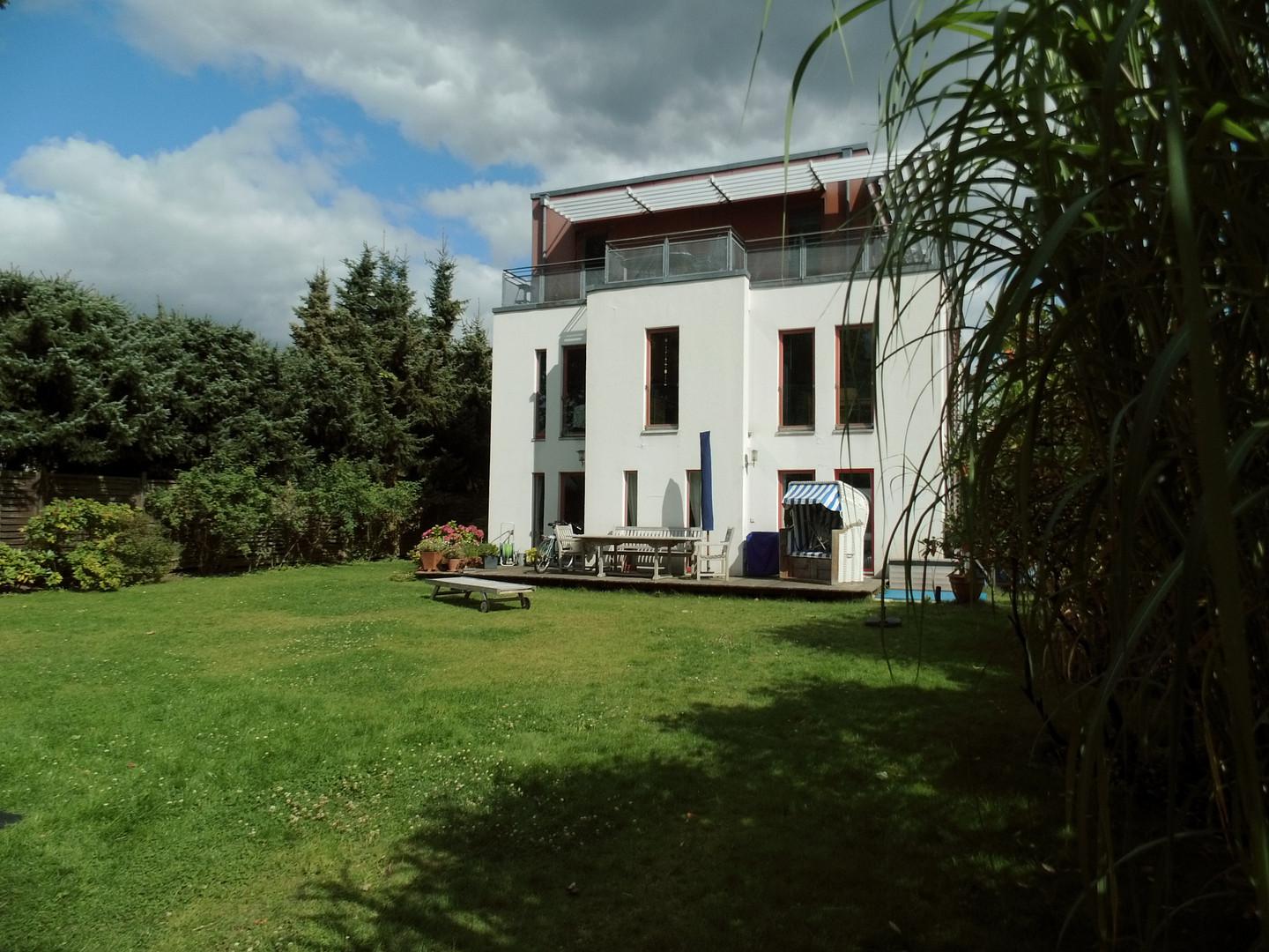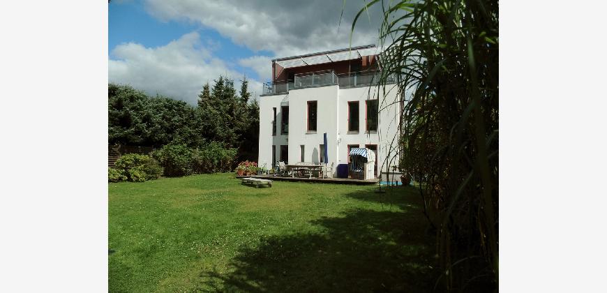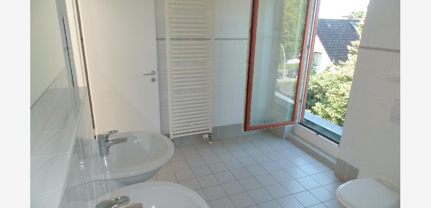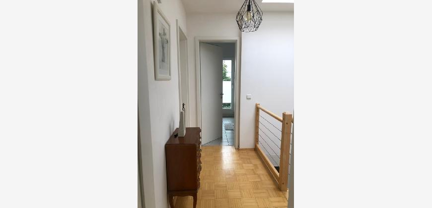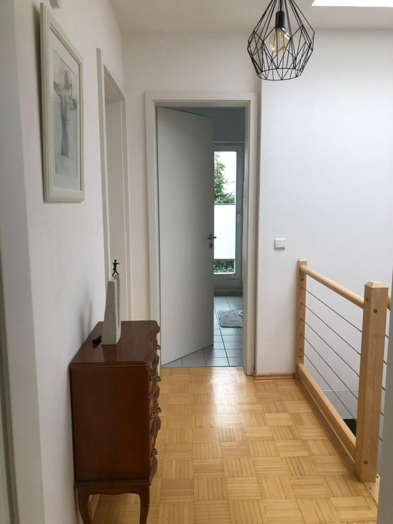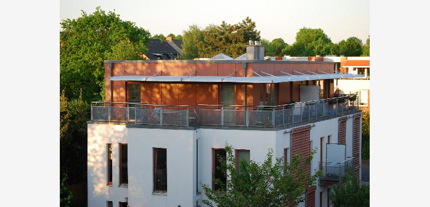 Vom Treppenhaus gelangt man in die geräumige Diele, von dem das 25 qm große Wohn- und Eßzimmer mit Balkon, die offene Küche, das Kinder- bzw. Arbeitszimmer, der praktische Abstellraum mit Waschmaschine sowie das türhoch geflieste Gäste-WC abgehen. Die hochwertige Einbauküche ist ausgestattet mit Cerankochfeld, Backofen, Dunstabzugshaube, Kühl-Gefrier-Kombination, Geschirrspüler, Edelstahlspüle, zwei Arbeitsplatten sowie diversen Ober- und Unterschränken. Der Lichteinfall kann mittels seitwärts gleitender Lamellenroste an der Südfassade nach Bedarf dosiert werden. Vom unteren Flur gelangt man über eine hölzerne Wendeltreppe zum oberen Flur, von dem das Schlafzimmer mit Panoramablick auf die Grünanlage, das Kinderzimmer und das 8,5 qm große Tageslichtvollbad mit großzügiger Ausstattung (zweiter Waschplatz, in die Zimmerdecke integrierte Halogenleuchte, türhohe Fliesung) abgehen. In das Schlafzimmer ist ein begehbarer Wandschrank integriert, der über ein eigenes Fenster mit Tageslicht versorgt wird. Über eine dreiflügelige Glastür gelangt man vom Schlafzimmer auf die 23 qm große, mit hochwertigen WPC-Planken ausgelegte Dachterrasse, welche die Süd- und Westseite der Wohnung umspannt. Aluminiumlamellen bieten Sonnenschutz und verhindern, daß der Regen gegen die Fenster prasselt. Alle Räume verfügen über Fenster, die meist zum Fußboden reichen. Durch ein kippbares Oberlicht über dem Treppenaufgang werden beide Wohnebenen zusätzlich mit Tageslicht durchflutet. Eine raumhohe Glasfläche in der Wand zum Wohnzimmer wirkt als zusätzliche Tageslichtquelle für die Diele. Der Fußboden ist mit hochwertigem Massivholz-Mosaikparkett ausgelegt. Der Kabelanschluß ist für Hochgeschwindigkeitsinternet (1.000 Mbit/s) tauglich. Die Gebühren der Wasserversorgung sind in den Betriebskosten enthalten.