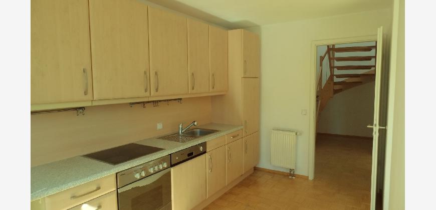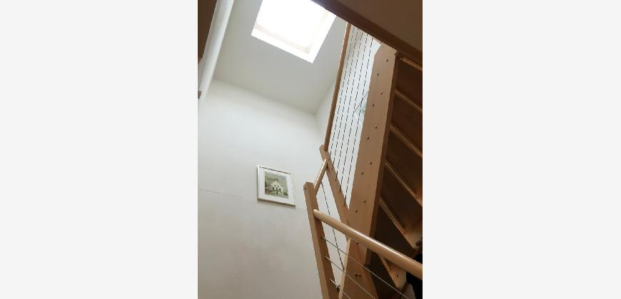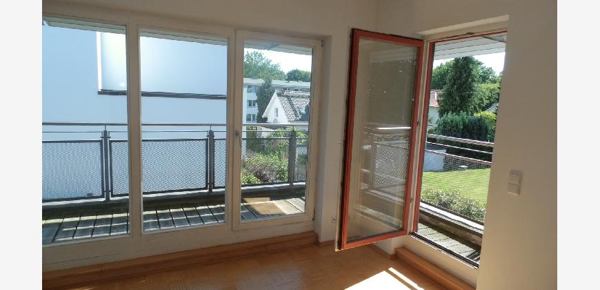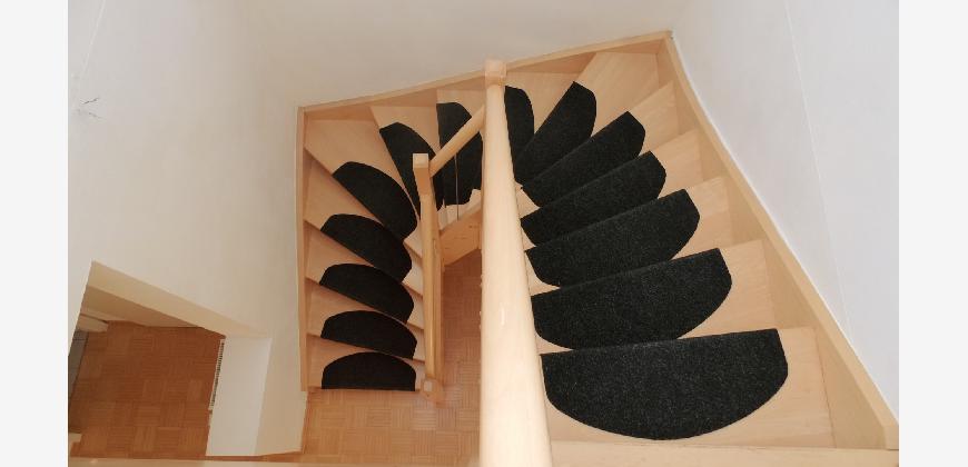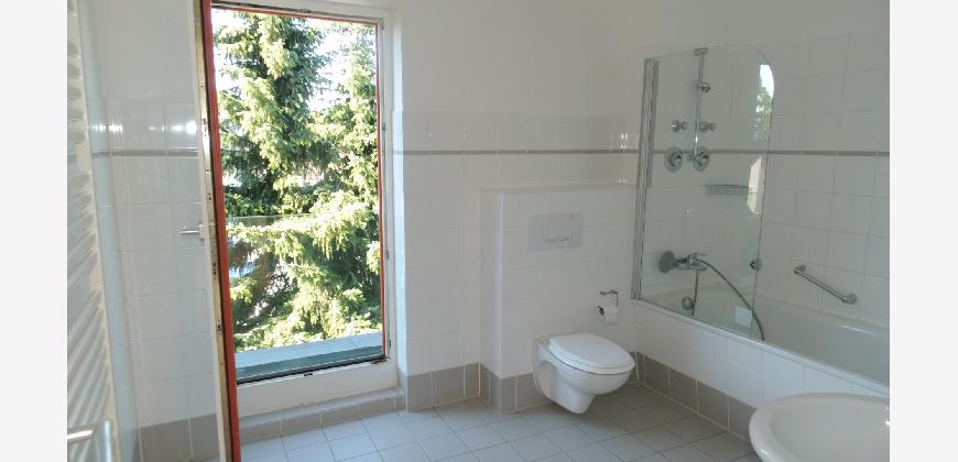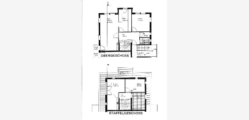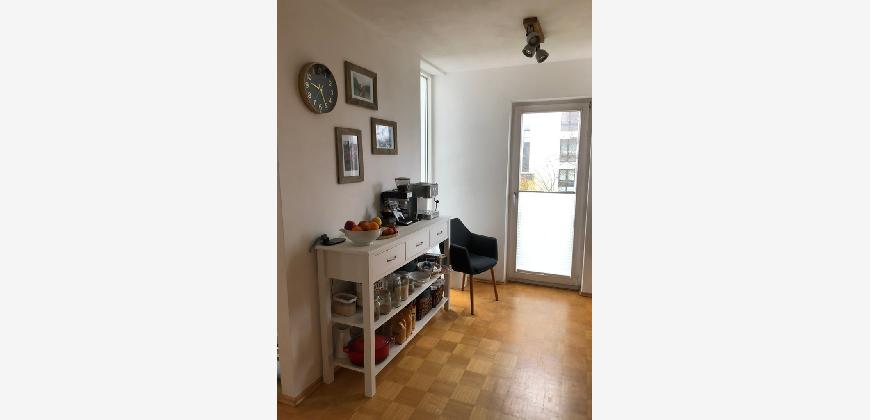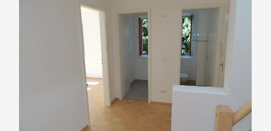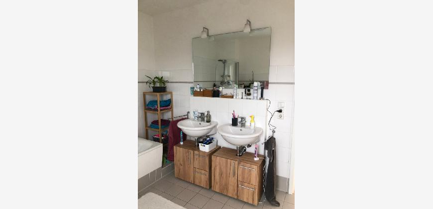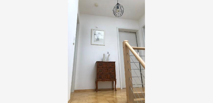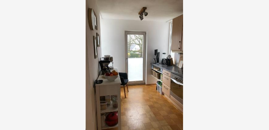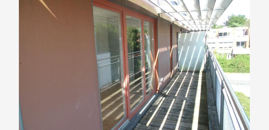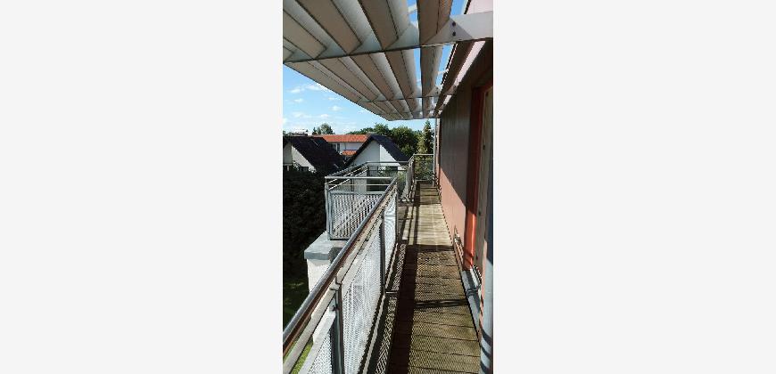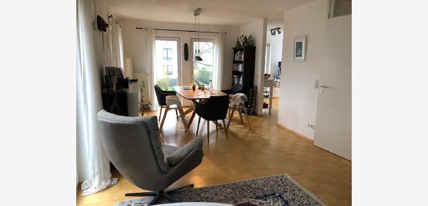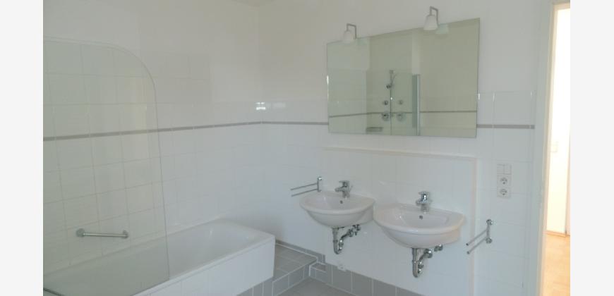 Vom Treppenhaus gelangt man in die geräumige Diele, von dem das 25 qm große Wohn- und Eßzimmer mit Balkon, die offene Küche, das Kinder- bzw. Arbeitszimmer, der praktische Abstellraum mit Waschmaschine sowie das türhoch geflieste Gäste-WC abgehen. Die hochwertige Einbauküche ist ausgestattet mit Cerankochfeld, Backofen, Dunstabzugshaube, Kühl-Gefrier-Kombination, Geschirrspüler, Edelstahlspüle, zwei Arbeitsplatten sowie diversen Ober- und Unterschränken. Der Lichteinfall kann mittels seitwärts gleitender Lamellenroste an der Südfassade nach Bedarf dosiert werden. Vom unteren Flur gelangt man über eine hölzerne Wendeltreppe zum oberen Flur, von dem das Schlafzimmer mit Panoramablick auf die Grünanlage, das Kinderzimmer und das 8,5 qm große Tageslichtvollbad mit großzügiger Ausstattung (zweiter Waschplatz, in die Zimmerdecke integrierte Halogenleuchte, türhohe Fliesung) abgehen. In das Schlafzimmer ist ein begehbarer Wandschrank integriert, der über ein eigenes Fenster mit Tageslicht versorgt wird. Über eine dreiflügelige Glastür gelangt man vom Schlafzimmer auf die 23 qm große, mit hochwertigen WPC-Planken ausgelegte Dachterrasse, welche die Süd- und Westseite der Wohnung umspannt. Aluminiumlamellen bieten Sonnenschutz und verhindern, daß der Regen gegen die Fenster prasselt. Alle Räume verfügen über Fenster, die meist zum Fußboden reichen. Durch ein kippbares Oberlicht über dem Treppenaufgang werden beide Wohnebenen zusätzlich mit Tageslicht durchflutet. Eine raumhohe Glasfläche in der Wand zum Wohnzimmer wirkt als zusätzliche Tageslichtquelle für die Diele. Der Fußboden ist mit hochwertigem Massivholz-Mosaikparkett ausgelegt. Der Kabelanschluß ist für Hochgeschwindigkeitsinternet (1.000 Mbit/s) tauglich. Die Gebühren der Wasserversorgung sind in den Betriebskosten enthalten.