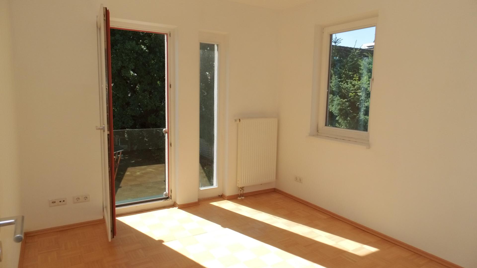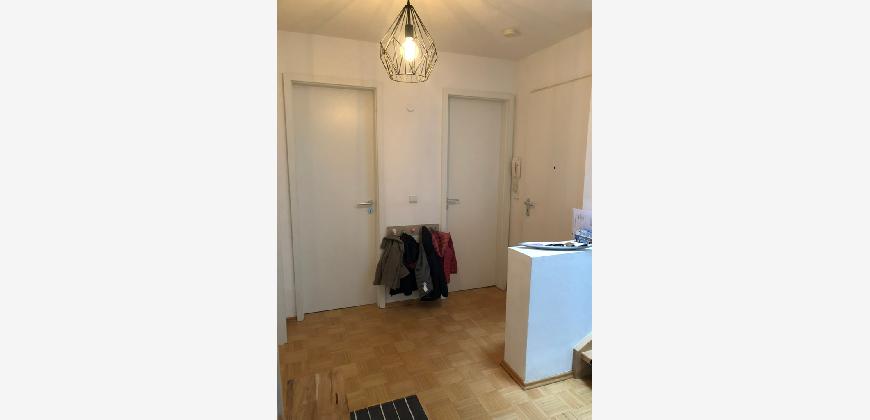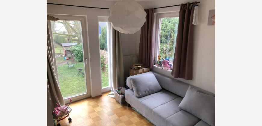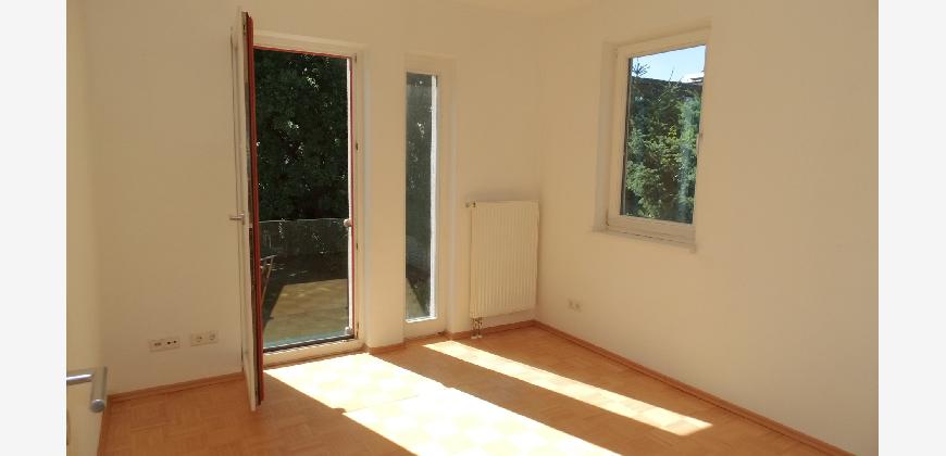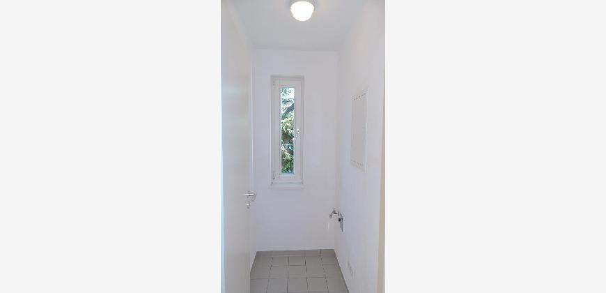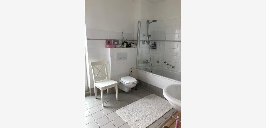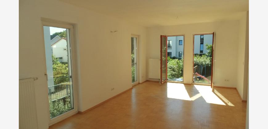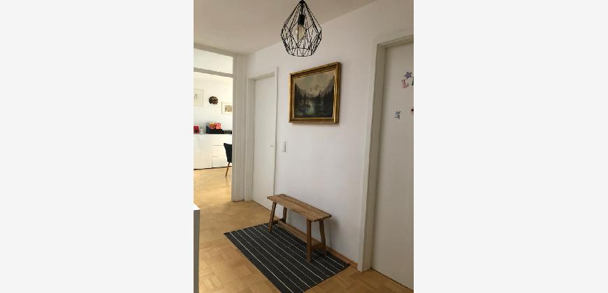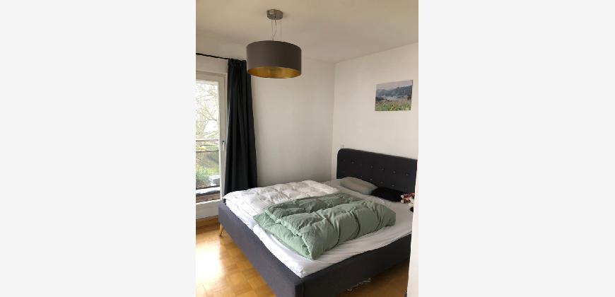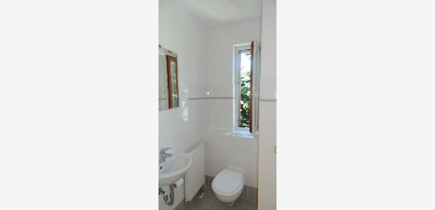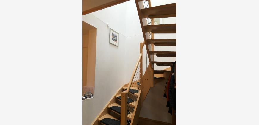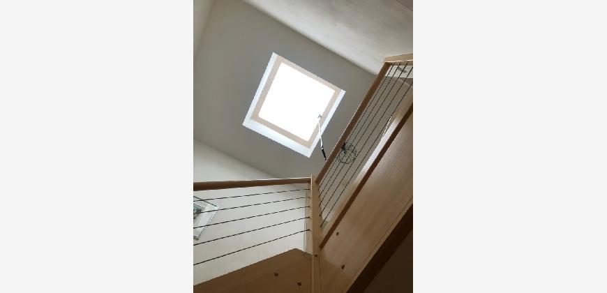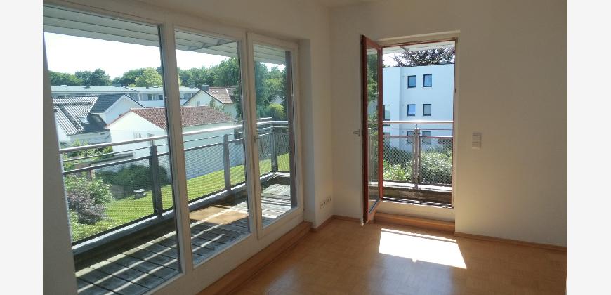 Vom Treppenhaus gelangt man in die geräumige Diele, von dem das 25 qm große Wohn- und Eßzimmer mit Balkon, die offene Küche, das Kinder- bzw. Arbeitszimmer, der praktische Abstellraum mit Waschmaschine sowie das türhoch geflieste Gäste-WC abgehen. Die hochwertige Einbauküche ist ausgestattet mit Cerankochfeld, Backofen, Dunstabzugshaube, Kühl-Gefrier-Kombination, Geschirrspüler, Edelstahlspüle, zwei Arbeitsplatten sowie diversen Ober- und Unterschränken. Der Lichteinfall kann mittels seitwärts gleitender Lamellenroste an der Südfassade nach Bedarf dosiert werden. Vom unteren Flur gelangt man über eine hölzerne Wendeltreppe zum oberen Flur, von dem das Schlafzimmer mit Panoramablick auf die Grünanlage, das Kinderzimmer und das 8,5 qm große Tageslichtvollbad mit großzügiger Ausstattung (zweiter Waschplatz, in die Zimmerdecke integrierte Halogenleuchte, türhohe Fliesung) abgehen. In das Schlafzimmer ist ein begehbarer Wandschrank integriert, der über ein eigenes Fenster mit Tageslicht versorgt wird. Über eine dreiflügelige Glastür gelangt man vom Schlafzimmer auf die 23 qm große, mit hochwertigen WPC-Planken ausgelegte Dachterrasse, welche die Süd- und Westseite der Wohnung umspannt. Aluminiumlamellen bieten Sonnenschutz und verhindern, daß der Regen gegen die Fenster prasselt. Alle Räume verfügen über Fenster, die meist zum Fußboden reichen. Durch ein kippbares Oberlicht über dem Treppenaufgang werden beide Wohnebenen zusätzlich mit Tageslicht durchflutet. Eine raumhohe Glasfläche in der Wand zum Wohnzimmer wirkt als zusätzliche Tageslichtquelle für die Diele. Der Fußboden ist mit hochwertigem Massivholz-Mosaikparkett ausgelegt. Der Kabelanschluß ist für Hochgeschwindigkeitsinternet (1.000 Mbit/s) tauglich. Die Gebühren der Wasserversorgung sind in den Betriebskosten enthalten.