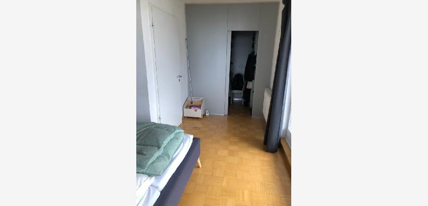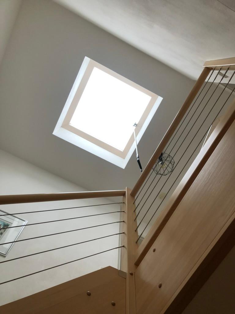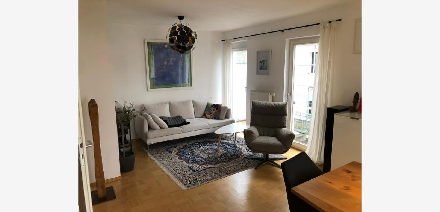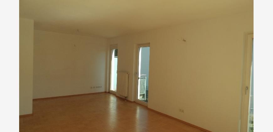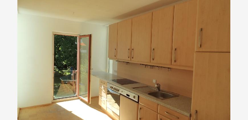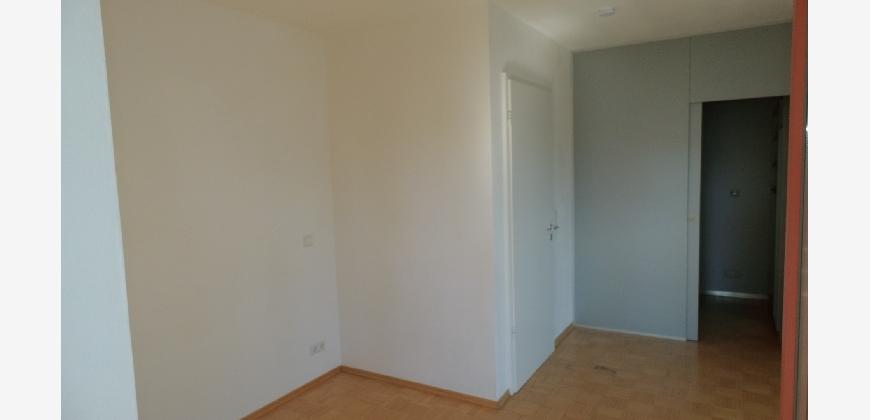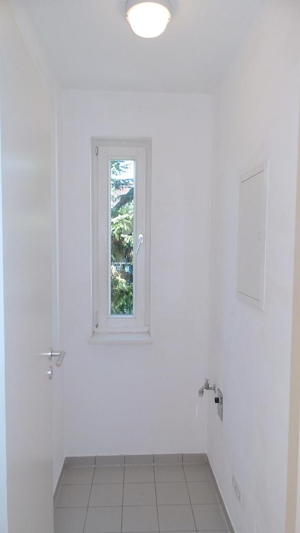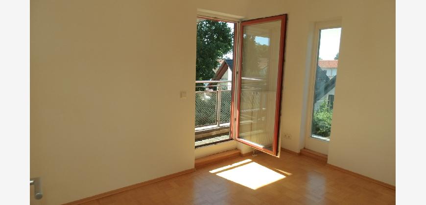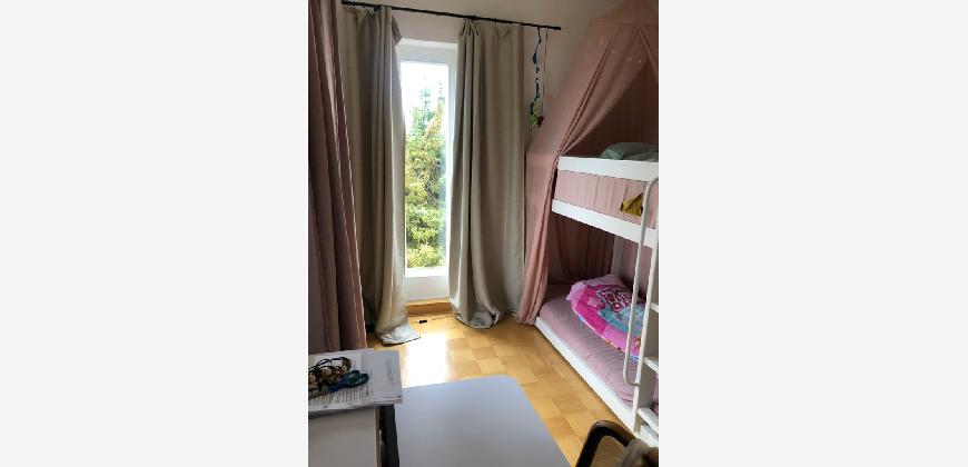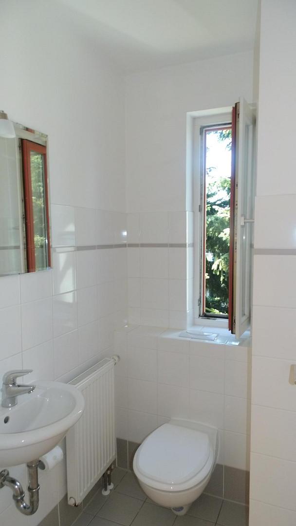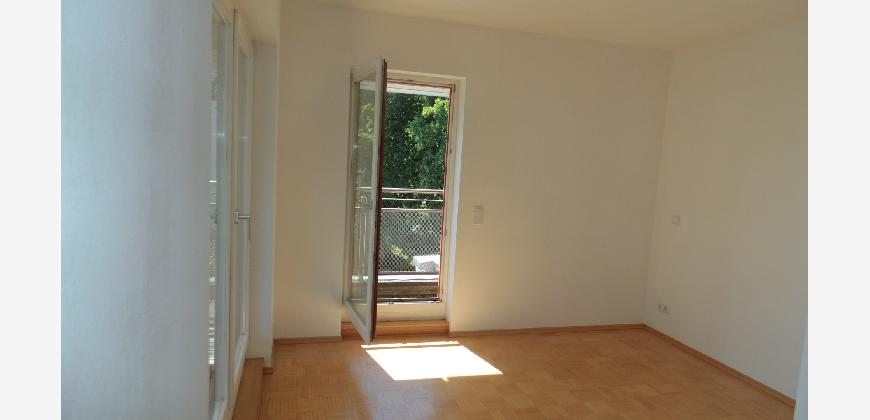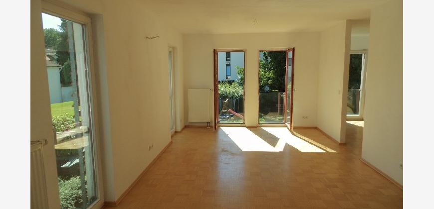 Vom Treppenhaus gelangt man in die geräumige Diele, von dem das 25 qm große Wohn- und Eßzimmer mit Balkon, die offene Küche, das Kinder- bzw. Arbeitszimmer, der praktische Abstellraum mit Waschmaschine sowie das türhoch geflieste Gäste-WC abgehen. Die hochwertige Einbauküche ist ausgestattet mit Cerankochfeld, Backofen, Dunstabzugshaube, Kühl-Gefrier-Kombination, Geschirrspüler, Edelstahlspüle, zwei Arbeitsplatten sowie diversen Ober- und Unterschränken. Der Lichteinfall kann mittels seitwärts gleitender Lamellenroste an der Südfassade nach Bedarf dosiert werden. Vom unteren Flur gelangt man über eine hölzerne Wendeltreppe zum oberen Flur, von dem das Schlafzimmer mit Panoramablick auf die Grünanlage, das Kinderzimmer und das 8,5 qm große Tageslichtvollbad mit großzügiger Ausstattung (zweiter Waschplatz, in die Zimmerdecke integrierte Halogenleuchte, türhohe Fliesung) abgehen. In das Schlafzimmer ist ein begehbarer Wandschrank integriert, der über ein eigenes Fenster mit Tageslicht versorgt wird. Über eine dreiflügelige Glastür gelangt man vom Schlafzimmer auf die 23 qm große, mit hochwertigen WPC-Planken ausgelegte Dachterrasse, welche die Süd- und Westseite der Wohnung umspannt. Aluminiumlamellen bieten Sonnenschutz und verhindern, daß der Regen gegen die Fenster prasselt. Alle Räume verfügen über Fenster, die meist zum Fußboden reichen. Durch ein kippbares Oberlicht über dem Treppenaufgang werden beide Wohnebenen zusätzlich mit Tageslicht durchflutet. Eine raumhohe Glasfläche in der Wand zum Wohnzimmer wirkt als zusätzliche Tageslichtquelle für die Diele. Der Fußboden ist mit hochwertigem Massivholz-Mosaikparkett ausgelegt. Der Kabelanschluß ist für Hochgeschwindigkeitsinternet (1.000 Mbit/s) tauglich. Die Gebühren der Wasserversorgung sind in den Betriebskosten enthalten.